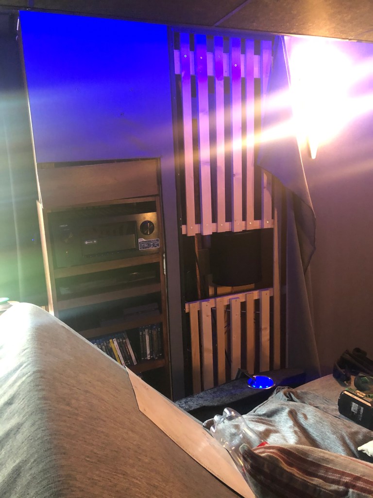 Päätin siis vihdoin ottaa surround kaiuttimeni seinältä alas ja testata miltä ne kuulostavat hieman alempana. Mainitsin aiemmin pakon sanelemista asioista, eli surround kaiuttimia ei saa suoraan sivulle johtuen laite räkistä, joten päätin asentaa ne karvan verran eteen, siististi kankaan taakse. Samalla kaiuttimien sijainti siirtyi 20 senttiä taaksepäin, joka toivottavasti tuo hieman lisää ”ilmaan” huoneeseen. Ratkaisu oli ehdottomasti oikea, jo testatessa ne kuulostivat todella hyvältä, ja sijainti aavistuksen edessä ei haittaa yhtään, etenkin kun edelleen on vielä käytössä myös taka surround kaiuttimet. Eron huomaa heti, äänimaailma tuntuu paljon avarammalta ja nyt myös Atmos kaiuttimien arvo nousee huimasti, nyt ne selkeästi erottaa surround kaiuttimista.