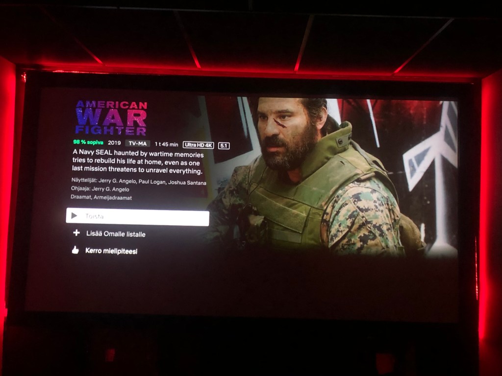 Ajattelin tänään tehdä pienen testin. Netflix antaa elokuvista aina arvioin sopivuudesta juuri minulle. Päätin testata näiden algoritmien toimivuutta ja lähdin Netflixin suosituksesta katsomaan elokuvaa American War Fighter, josta Netflixin suositus oli 98%. Ei todellakaan ensimmäinen eikä viimeinen sodan vaikutuksista kertova elokuva, mutta ehkä paras, jonka ole nähnyt.