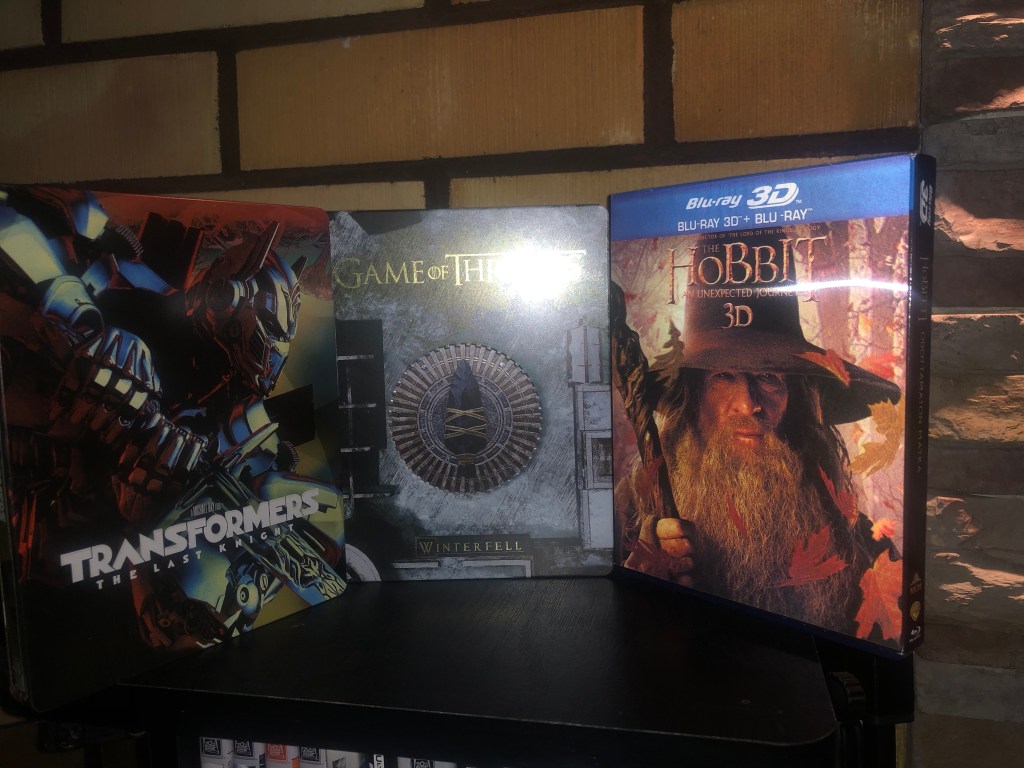 Liikkeen hintataso oli vähintäänkin kohtuullinen, tosin koska kyseessä oli pääsääntöisesti vain uusia leffoja, ei liikkeestä juurikaan löytynyt niitä etsimiäni ”vitosen” Atmosleffoja. Valikoimaa kuitenkin oli kivasti ja kyllähän sieltä sitten jotain hyvää tarttui käteenkin. Kahden kohtuullisen edullisen (toinen jopa se 5e) 3d leffan (Hobitti – an Unexpect Journey ja Transformers) lisäksi todellinen helmi, eli Game of Thrones season 8 UHD-levyillä. Luulin tuon tulevan myyntiin vasta joulukuussa, ja ajatuksena olikin tuon hankkiminen lähinnä itselleni joululahjaksi. No, joulu tulikin sitten tänä vuonna hieman ajoissa ja pakko se oli sieltä napata mukaan. Jaksot 1-7 löytyy hyllystä Bluraynä, ja pitkään oli mietinnässä onko tuohon UHD tasoon tässä tapauksessa tarpeellista satsata. Toisaalta nyt kuin näin nuo kaksi levyä hyllyssä vierekkäin, ja hintaero vain kymmenisen euroa, ajattelin, että kyllä minä tuon kymmenen euroa enemmän maksan sarjasta, joka kuitenkin kestää useita tunteja, ei vain yksi leffa.