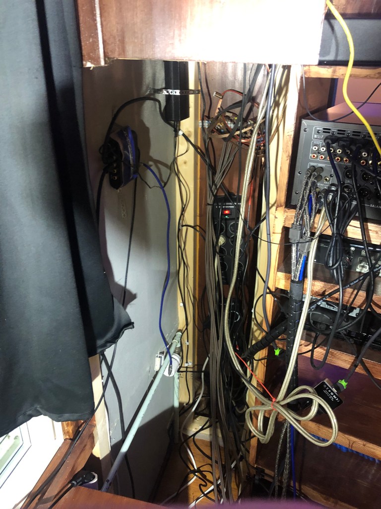 Rotelin hankinnan myötä päätin sitten samalla järjestää ”konehuoneen” hieman uusiksi. Johtoja on lisäilty sitä mukaan kun laitteita on uusittu, mutta missään vaiheessa niitä ei ole laitettu kunnolla järjestykseen. Lähtökohtaisesti jo päätin, että uusi Rotel (5x120w) tulee ajamaan pää- ja surrounkaiuttimia, ja aikaisemmin hankittu 985 (5×100) siirtyy ohjaamaan Atmoksia. Kolmas jo valmiina ollut Pro-Ject (2x100w) sitten puolestaan saa jatkossa vastuulleen kaksi taka-surround-kanavaa. Päätin siis tämän sekamelskan selvittämiseksi katkaista kaikki laitetilaan tulevat kaiutin kaapelit ja laittaa ne siististi sokeripaloilla riviin, joihin ei tarvitse enää koskea. Mikäli jotain johtoja tarvitsee jatkossa jostain syystä muuttaa, se onnistuu vain muuttamalla tätä pientä pätkää. Konehuoneesta tuli näin todella paljon siistimpi, ja samalla laitoin myös jokaisen johdon päähän banaani-liittimet.