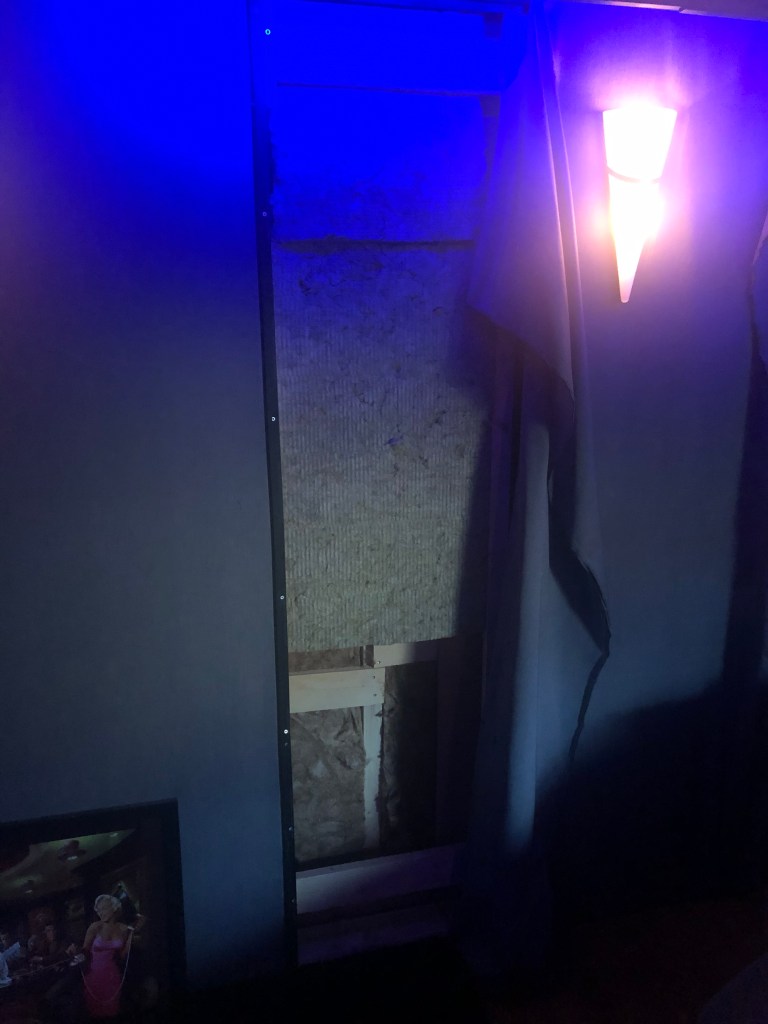 En tiedä onko tästä huoneen äänille mitään merkitystä, mutta joka tapauksessa tämäkin nyt tuli tehtyä. Olin tämän jälkeen jo laittamassa tietokonetta ja Dirac Liveä valmiiksi kun homma alkoi hieman jo kyllästyttämään. Mietin, että onkohan huoneessa nyt kaikki varmasti hyvin, jotta ääniä ei tarvitsisi enää hetkeen uudelleen laittaa. Siinä vaiheessa keksin vielä yhden pienen asian joka on ollut mielessä, eli takaseinälle MLP (pääkatselupaikka) piti jossain vaiheessa saada vielä yksi vaimennuslevy. Päätin sitten, että tehdään nyt sitten sekin valmiiksi kerralla, tarvikkeet kun kuitenkin löytyi suoraan varastosta. Tuonkaan vaikutuksista huoneen akustiikkaan en osaa sanoa, mutta nyt on sekin kivi käännetty.