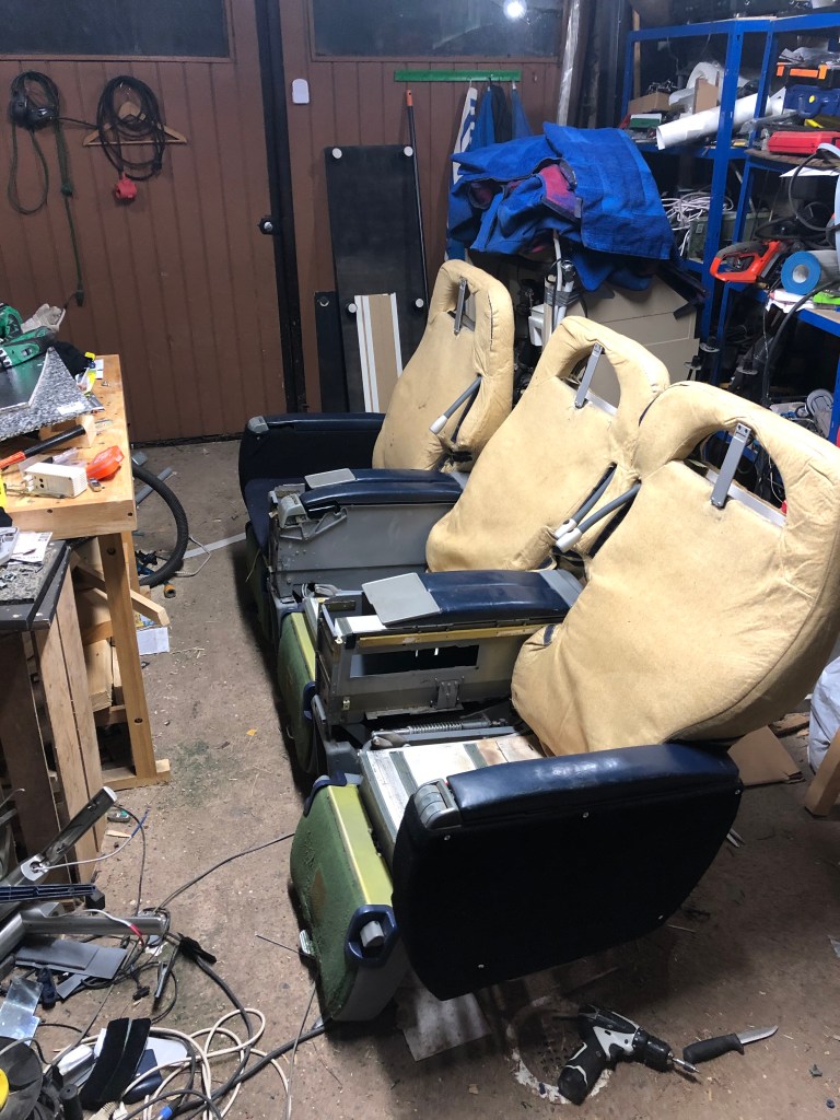 Piti siis keksiä jotain muuta, ja vastaus löytyi tällä kertaa Facebookin Marketplacelta, tai ainakin toivon niin. Kotimatkalla kävin noutamassa Tampereelta kolmen istuttavan lentokoneen Business-luokan istuinyksikön ja sen kanssa on nyt tullut päivä puuhasteltua. Oletin ostavani tuolit, jossa on olisi kolmeen suuntaan sähköllä säädettävät mekanismit, mutta taisinkin saada jotain vielä parempaa. Sähköjä selvitellessä nimittäin tajusin, että eihän nämä tuolit olekaan sähköllä säätyvät, vaan niissä on itseasiassa kaasujousella toimivat säädöt. Tuolin selkänoja kaatuu, samalla tiltaten aavistuksen koko tuolia. Omasta napistaan nousee jalkatuki ja yllätyksekseni huomasin vielä, että kolmannesta napista toimii ilmalla toimiva ristiselän tuki. Näissä tuoleissahan on potentiaalia paljon enemmän kuin osasin edes toivoa, ja jos kaikki vielä toimii ilman sähköä niin vielä parempi. Tuolien sininen pinta ei ole aivan täysin sitä mitä ehkä toivoin, mutta pinta on itse asiassa todella laadukasta kangasta ja erittäin siistissä kunnossa, joten se on siihen jäämässä. Muuten sitten koitankin saada tuolit näyttämään hieman enemmän leffatuoleilta lentokoneen tuolien sijaan. Projektia seurataan tässä blogissa tiiviisti.