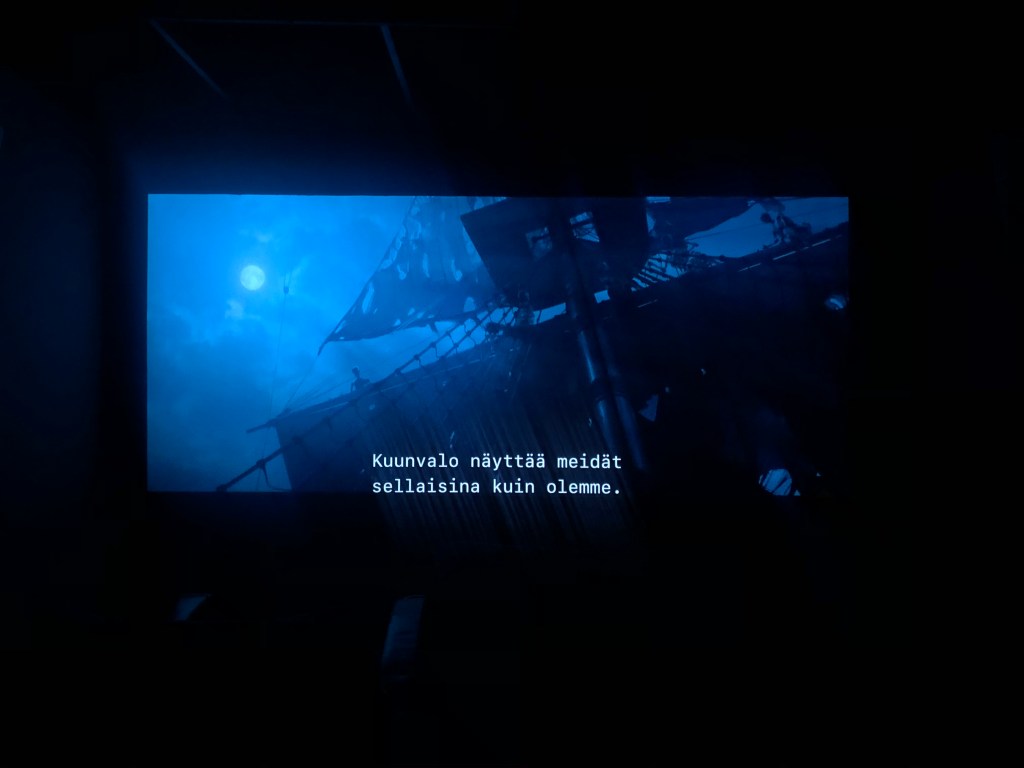 Leffa tuli tietysti katsottua myös toiselta kantilta, eli äänien. Äänet olivat Atmosta, ja tuli sen verran tarkasteltua, että alkuperäisissä äänissä Atmos toimii, suomeksi puhutulla raidalla (joka siis myös löytyy) äänet ovat vain Dolby Surround, oletettavasti siis 5.1. Atmos-raita oli todella vakuuttava, kuten olettaa sopii. Olettaa sopii siksi, että leffassa myrsky ja tuuli tuivertaa jatkuvasti ja subbareita käytetään todella mainiosti. Surroundit ja atmokset ovat hyvin käytössä, mutta jotenkin hieman vaimea, lieneekö nyt sitten kyse leffasta vai säädöistä, mutta jotenkin hieman kovempaa ääntä olisin sieltä toivonut, sillä ääniä sieltä kuitenkin kivasti kuului. Sori, että tästä pitää jälleen mainita, mutta ne buttkickerit.. Wau, taas kerran iso WAU.. Joka hetki tuntuu kuin istuisi suoraan tuon leffan sisällä itsekin. Jos butkickerit laittaa kiinni, huone tuntuu heti aivan erilaiselta. Subbareista saa varmasti tarpeeksi voimaa, mutta mikään ei ole enää mitään ilman näitä. Mahdoton selittää, jos ei ole itse kokeillut.