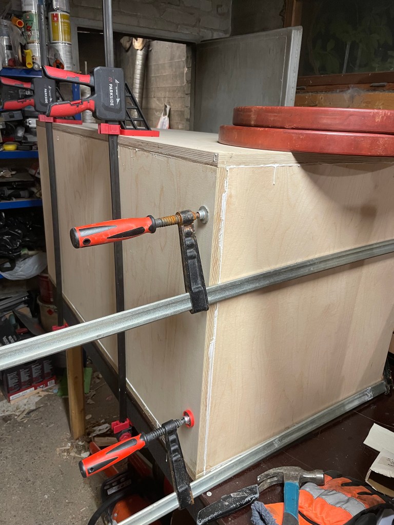 Lisäksi myös eilen sain kotiin Full Martyjen vanerit, eli 21mm koivuvanerilevyt, ja niiden työstäminen tietysti alkoi myös heti tänään. Ensimmäisen laatikon ensimmäiset saumat on liimatta, ja pakko kyllä todeta, että aikamoiset laatikot on noista tulossa, puhumattakaan aika kiitettävän kokoisista elementeistä, jotka niihin kiinni isketään aikanaan. Mielenkiintoisia aikoja siis jatkossakin.