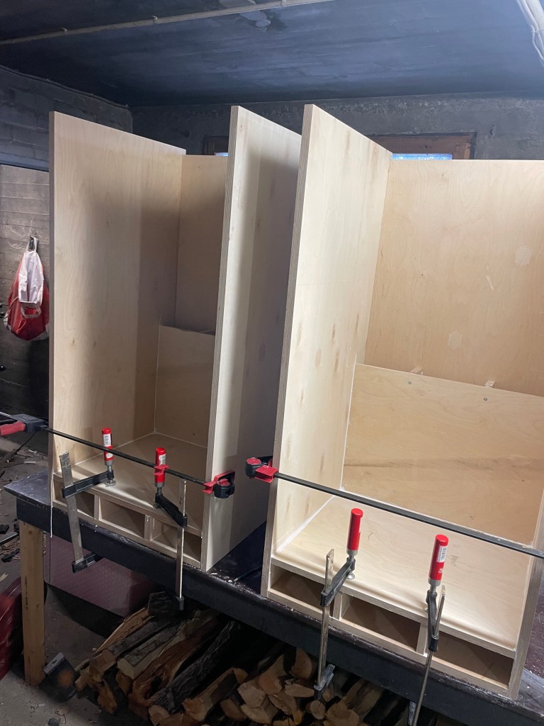 Ensimmäinen vaihe oli jäälleen takaseinän, kahden sivun ja pohjan yhteenliittämistä. Ehkä viime kerrasta oli jotain opittu, sillä tämä vaihe meni aika sujuvasti ilman virheitä paikalleen. Ainoa, mitä näin jälkikäteen voisi vielä parantaa on se, että hyllystä pitäisi ehdottomasti löytyä pari yli 122cm puristinta, jos full martyjä alkaa tekemään. Isoja puristimia on nyt jo monta, mutta valitettavasti kaikki aavistuksen tuota lyhyempiä. Pohjan saaminen puristuksiin oli siis aika haaste, joka ruuveilla lopulta saatiin taklattua. Ei paras vaihtoehto etenkin suhteellisen pehmeään vaneriin, mutta pohjaan ei sinällään rumat ruuvit haittaa.