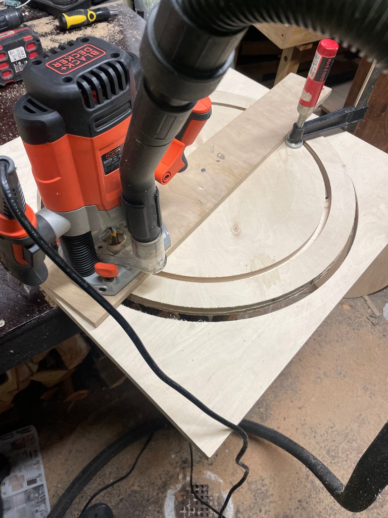 Työkalu, jolle Martyjä tehdessä onkin sitten paljon enemmän kuin paljon käyttöä on yläjyrsin. Ensin tehdään kuvassa näkyvä tukirengas elementille, sen jälkeen tehdään isoreikä etulevyyn, ja lopulta vielä viimeiseen etulevyyn tehdään reikä elementille ja avataan porttien reijät. On jännä ajatella, miten näitä on joskus vielä tehty pistosahalla, kun yläjyrsimellä tuo homma vaan menee niin paljon sujuvammin siistimmin, puhumattakaan lopputuloksesta. Tosin, pitää sanoa, että yksi terä meni taas tuossa paksussa levyssä rikki, joka aiheutti yhteen porttiin pieniä kauneusvirheitä. Eipä niistä kuitenkaan mitään lopullista vauriota tullut, eli jos asiasta ei tiedä, niin tuskin sitä kukaan edes huomaa. Lopuksi sitten vielä kun laatikko on kasassa niin jyrsitaan kaikki reunat taisisiksi ja pyöristetään. Pyöristyksen määrä on toki sitten jokaisen oma asia, itse en ihan hirveästi pyöristä, mutta hieman siistimmäksi kuitenkin. Käsittääkseni myös äänen kannalta noiden porttien suiden pyöristäminen on tärkeää, jotta ääni pääsee sujuvasti liikkumaan.