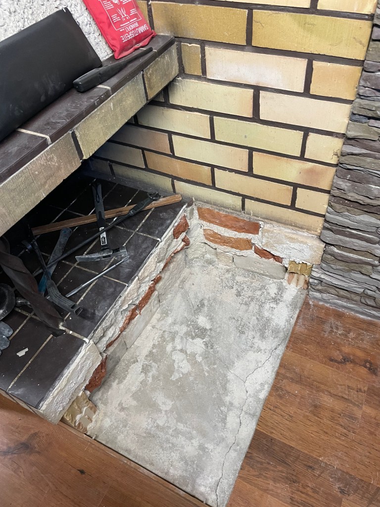 Eli ei muuta kuin vasara käteen ja tutkimaan mitä tuo taso on syönyt. Onneksi se lähti siitä aika kivasti pienellä naputtelulla purkautumaan ja loppujen lopuksi oli kyllä suhteellisen helppo homma ottaa pois. Kun alla vielä oli hyvä betonilattia samassa tasossa kuin muu lattia, niin eihän tuossa todellisuudessa tarvinnut kuin nostella tiilet pois ja himan naputella rappausta. Osa tiilistä oli muutenkin vain kasattu pohjalle, ei kiinnitetty laastilla lainkaan.