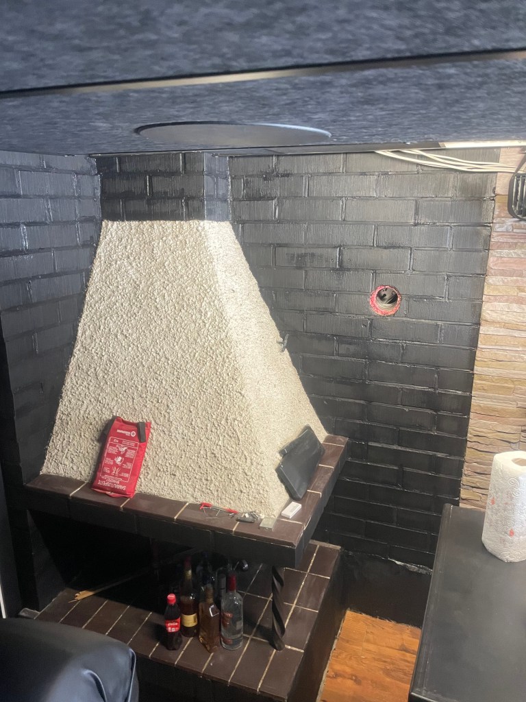 .. Ja näin, takan lisäosa on poissa, ja seinä enää siistimistä vaille valmis. Toki, nyt sitten herää kysymys, että millä tuon saa siistiksi (toki jää kokonaan subbarin taakse), mutta pitäisikö tuo koko seinä maalata sitten samalla mustaksi? To be continued..