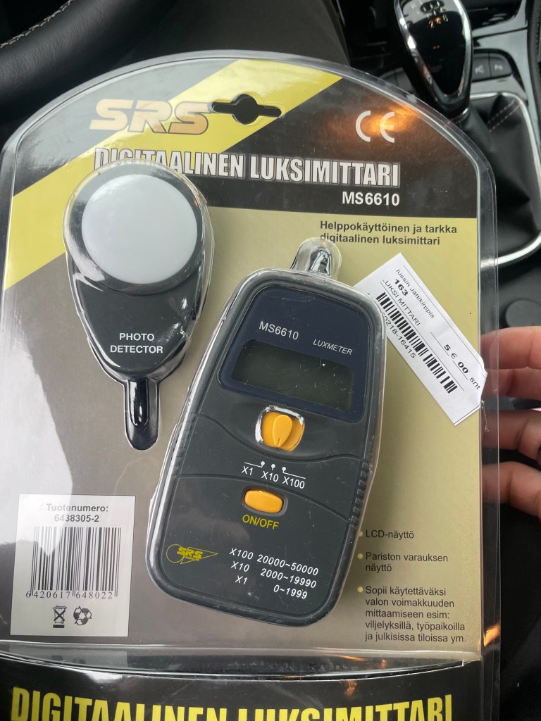 Testailuun liittyen muuten vielä pieni sellainenkin juttu, että mietin jokuaika sitten että olisi kiva hankkia jonkinlainen lux-mittari, että voisi vähän testailla, jotain kuvan kirkkautta ja muuta, mutta en sitten sellaista missään vaiheessa hankkinut. Jossain oli puhetta, että hyvin halvallakin saa paljon aikaiseksi, mutta en ole sellaista vielä ehtinyt selvitellä sen enempää, enkä siis oikeasti tiedä mitä sellaisella siis tekisin. Yksi kiva juttuhan olisi ollut tietysti testata uuden lampun valotehoa verrattuna vanhaan, mutta se meni jo. Oishan sitä kiva myös jotenkin testata valkoista ja harmaata kangasta, mutta siihen ihan valonmäärämittarilla ei kyllä taida päästä. Eli lähinnä siis leluksi tuollaista katsellut ja eilen sitten sellainen hyvinkin lelulta näyttävä laite tuli vastaan kirpputorilla viiden euron hintaan niin pitihän se siitä napata mukaan. Laitteen laadusta tai muusta en sen kummemmin tiedä, avaamaton paketti ja kolmen kympin hintaa näyttää google nopealla selailulla. Saapa nähdä mitä tästä sitten vielä seuraa kun pääsee kokeilemaan.