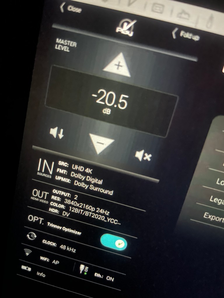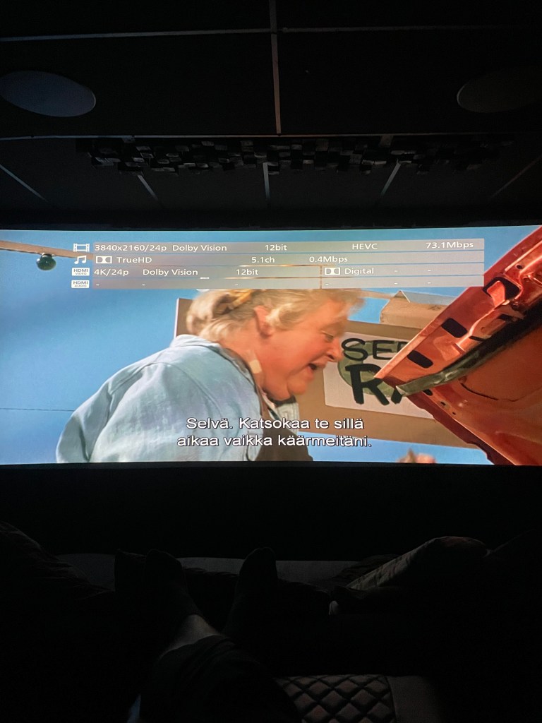 Kuvanlaatu oli leffassa jälleen saatu restoroitua aivan älyttömän upealle tasolla. Näissä vanhoissa leffoissa mikään muu ei erota kuvaa vuoden 2023 leffoista kuin maisemat ja vanhoilta näyttävät ihmiset. Niitä on aika vaikea alkaa muuttamaan mihinkään, mutta kuvanlaatu on kivaa katseltavaa läpi leffan. Vielä kun tässä oli äänienkin osalta nähny sen verran vaivaa, että raidaksi oli tehty uutta Atmosta, joten nyt oli palikat vanhassa leffassa aika kohdillaan. Äänien osalta jotain kuitenkin oli pahasti pielessä ja meni todella paljon aikaa löytää ratkaisu. Mietin pitkän aikaa miksi Trinnov näyttää vain Dolby Digital raitaa, vaikka kaikki tulopuolen kanavat ovat aktiivisia ja kaiken pitäisi olla kunnossa. Lopulta vasta Panasonicin palauttaminen menu sivulle palautti Atmoksen ruutuun. En oikein tiedä mitä tuossa tapahtui aikaisemmin, kaikki kuulosti kyllä hyvältä, mutta jotain kuitenkin puuttui. Soittimenkin info kuitenkin kertoi raidan olevan Atmosta, joten en nyt oikein ymmärrä mistä tuo johtui.
