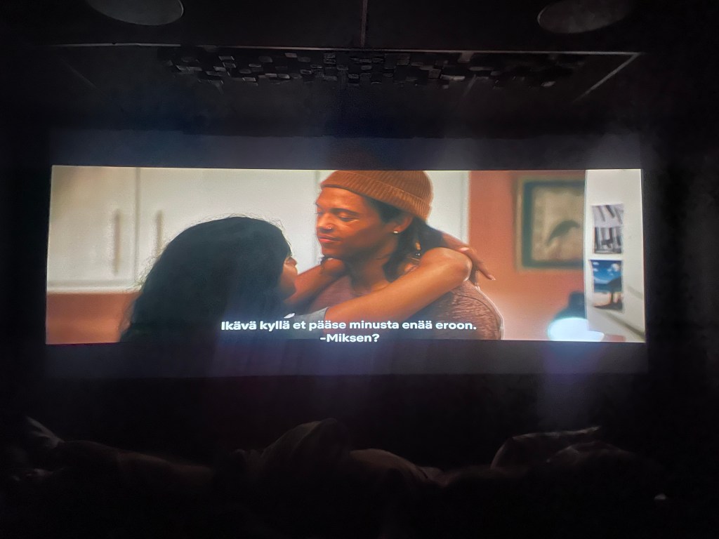 Äänien osalta päästäänkin sitten siihen puoleen, mikä tässä harrastuksessa on hienointa. Vaikka puhutaan kahdesta todella premiun tason huoneesta, silti äänen sävy huoneissa voi olla hyvin erilainen. Ei ole yhtä ja ainoaa referenssi ääntä, johon jokaisen pitäisi pyrkiä, vaan jokainen kaiutin, jokainen vahvistin ja ennen kaikkea jokainen tila kuulostavat omalta uniikilta soundiltaan. Ensimmäinen fiilis tästä tilasta jo heti Dune-leffan alettua oli wow, onpa tila ja ääni avara. Äänimaailma, jota toisaalta omaan huoneeseen toivoisin enemmän, mutta toivoa voi, huoneen mitat eivät siitä mihinkään kasva. Toki myös kaiuttimillakin on merkitystä, ja nämä kaiuttimet muodostivat todella avaran äänikentän, unohtamatta ainuttakaan yksityiskohtaa.