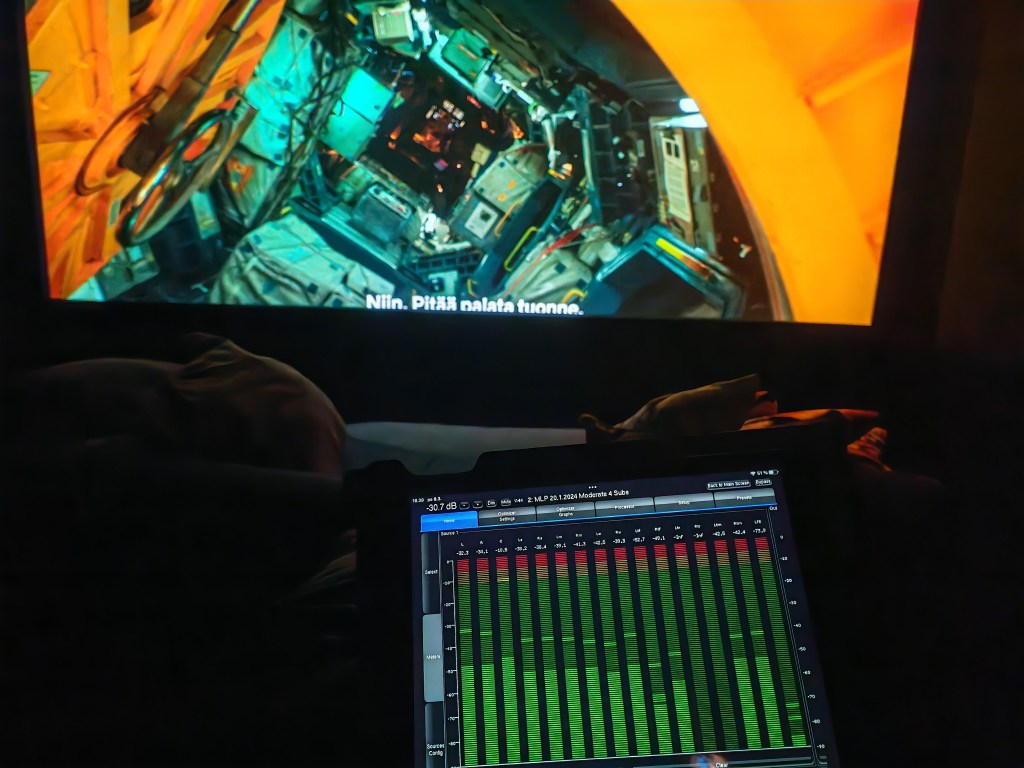 Tuossa tilassa varmasti tärkeämpänä juttuna on tuo kaksikanava ja osittain varmaankin sen takia myös leffa puolella on paljon kompromissejä. Leffakäytössä on vain yksi, mutta sitäkin laadukkampi subbari, joka täyttää tilan kyllä hienosti, mutta toki aiheuttaa rajoitteita tasaiselle vasteelle useammalla paikalla. No, jos tilassa on useimmiten vain yksi kuuntelija, saa yhdenkin subbarin helposti kalibroitua loistavaksi siihen paikkaan, ja siinä sain nyt itse istuakin. Katossa kaiuttimia on neljä, ne ovat hyvässä paikassa ja toimivat erittäin hyvin. Tässäkin tilassa sen suurimman haasteen kuitenkin asettaa itse tila, eli kun ei ole mahdollisuutta laittaa akustisesti läpinäkyvää kangasta, niin keskikaiuttimen kanssa joudutaan aina tekemään jonkinlaisia kompromissejä. Tämä toki vain minun mielipide, mutta minulle keskikaiuttimen ainoa oikea paikka on keskellä skriinin takana. Takakaiuttimia tässä tilassa oli neljä ja ne olivat hieman poikkeuksellisesti etu ja takaviistossa. Hienosti tämä kuitenkin toimi. Yleensähän surroundit ovat kuuntelupaikan sivuilla tai hieman takana, nyt etummaiset olivat suurin piirtein front wide paikassa ja taka takasurroundit normaalien surroundien paikalla.