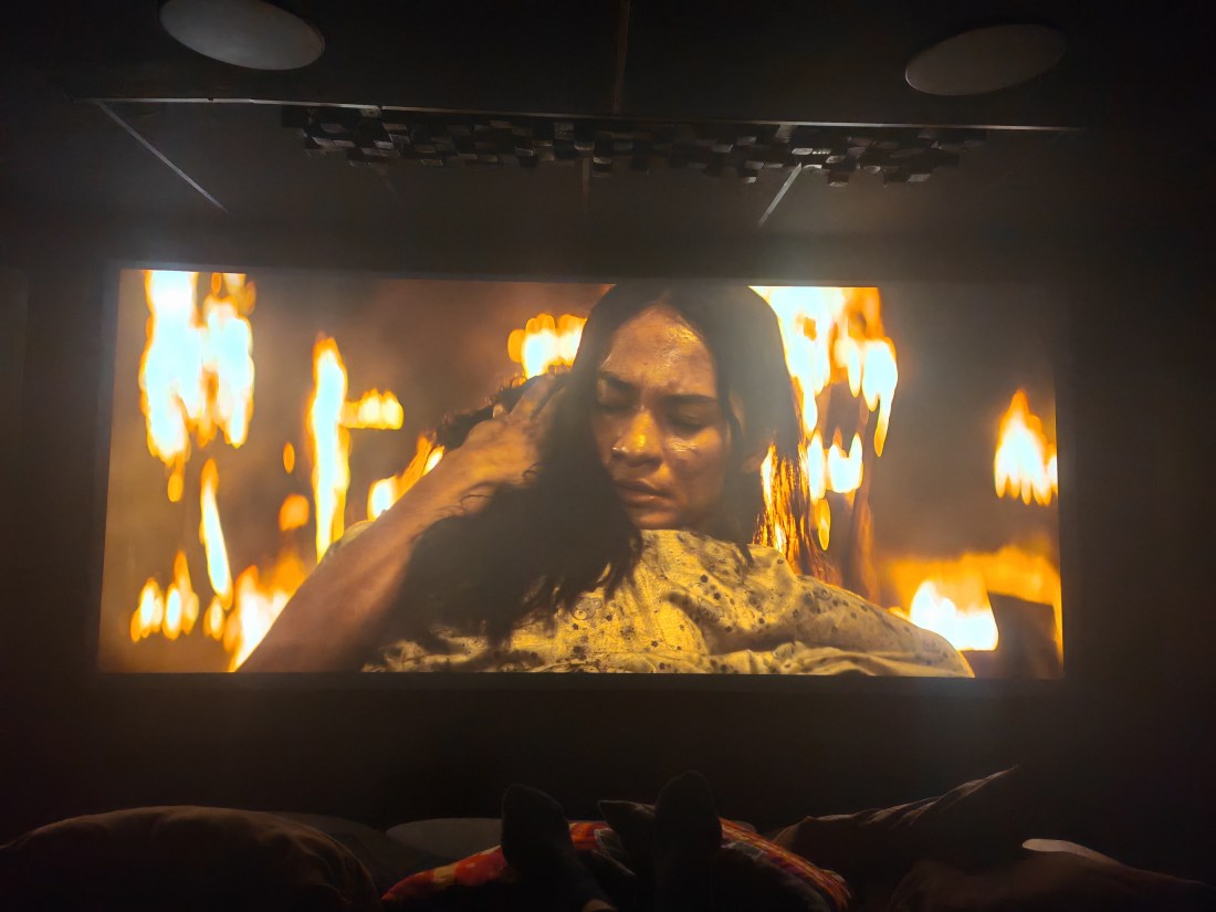 Leffa toimitettiin minulle Vimeossa, joten äänien ja kuvan osalta ei ollut odotukset kovinkaan korkealla. Muutenkin tälläiset verkossa tarjoillut katselut eivät yleensä ihan ymmärrettävistä syistä olleet kovinkaan laadukkaita materiaaliltaan, puhumattakaan niistä, joissa on vesileimoja ym vielä lisäksi. Enkä nyt siis kritisoi millään tapaa itse asiaa, näinhän se tietysti menee, mutta usein omassa huoneessa ei vaan yleensä tule katselua, vaikka mahdollisuuksia olisikin. Mutta onhan tämä silti hienoa että tällaisia tilaisuuksia tarjotaan ja silloin niihin pitää rohkeasti tarttua. Tällä kertaa tuo tarttuminen muutenkin palkitsi, nimittäin leffahan oli tässäkin formaatissa aika hyvänlaatuinen ja täytti kyllä hienosti lähes koko ruudun. Kuva oli 16:9 muodossa, eli mustat palkit kuvan sivuun jäivät, mutta sellainen sivuhuomio pitää tässä vaiheessa todeta, että uudella tykillä tuo ei oikein enää häiritse lainkaan, sen verran mustaa on kuvan ulkopuolellakin. Leffaa koitin katsoa Vimeon appilla, jota ei Apple TV näyttänyt enää edes tukevan, ja muutenkaan en sitä osannut niin hyvin käyttää, että olisi tiennyt miten leffan olisi sitä kautta voinut katsoa. Lopulta striimasin leffan kännykästä Chromecastin kautta Shieldiin, ja sitä kautta homma pelasikin tosi hyvin. Itse asiassa aika siistiä, että myös striimaamalla kännykästä Shieldiin saa näin hyvän kuvan ruudulle.