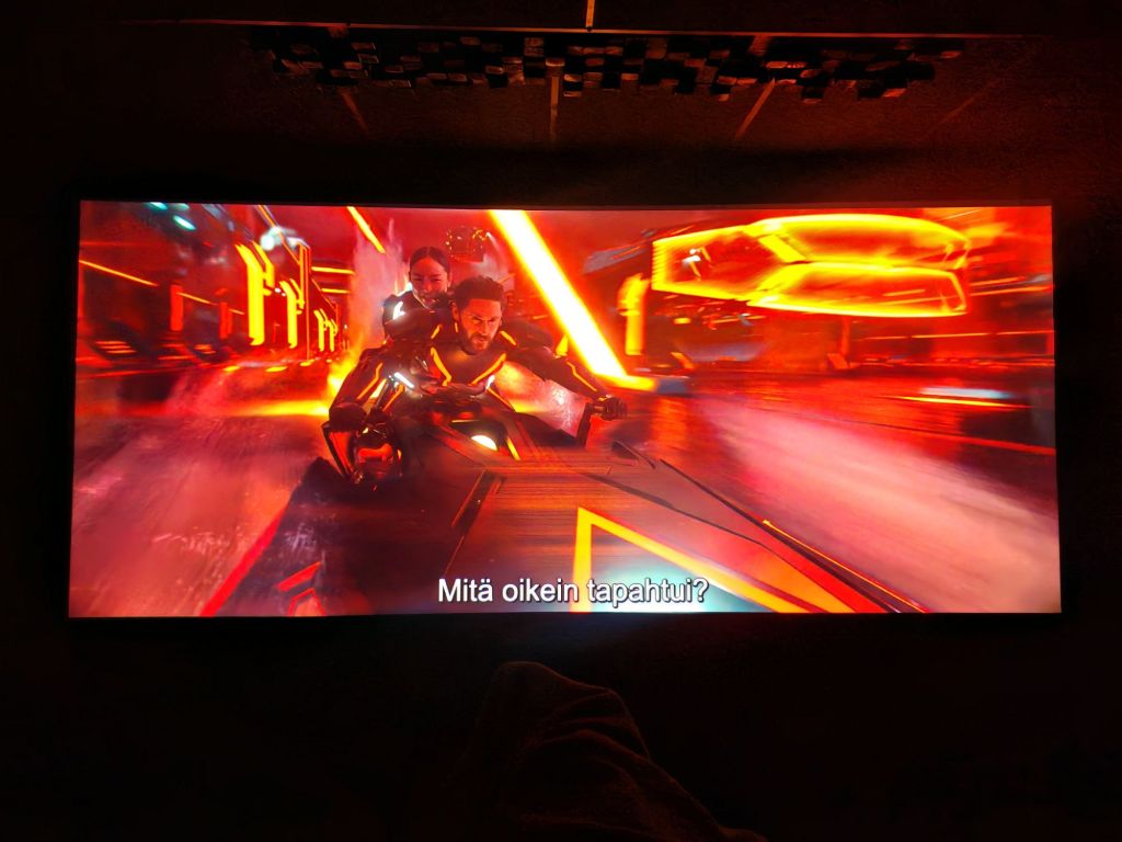 Ja kuva. Jos joku ei ole koskaan katsonut Tron leffoja, niin ainakin Legacystä tutut punaiset värit varmasti ainakin ovat kaikille jossain määrin tuttuja. Eikä varmasti ole kenellekään pieninkään yllätys, että myös tässä leffassa se punainen väri on se, joka löytyy ihan jokaisesta julisteesta, videosta ja toki itse leffakin on hyvin punainen. Se vuoksi tietysti omakin huone piti leffan ympärillä verhoilla punaiseen väriin, niitä pieniä huoneeseen liittyviä yksityiskohtia, joilla on vaan kiva leikkiä, vaikka mitään muuta merkitystä asialla ei olekaan. Kuten jo tuossa mainitsin, kun leffa elää pääosin mielikuvistumaailmassa, niin mahdolillisuuksien rajat ovat aika korkealla. Tron Areksessa näitä rajota todellakin etsitään, enkä kyllä voi missään hetkessä sanoa, että jossain asiassa olisi menty jollain tapaa yli, tämä nyt vaan on todella tyylikäs leffa myös kuvan puolesta. Kuva on jäätävän hyvää laatua, kirkasta väriä tuodaan ruudulla lähes häikaistymiseen asti ja tämän leffan katsottuna ainakin tietää missä oman huoneen rajat menee. Eikä se punainen väri todellakaan ole ainoa asia tässä leffassa, kaikki on tehty suurella ajatuksella, eikä mikään tässä leffassa ylitä sitä ajatusta, että nyt tehdään jotain todella näyttävää, oli kohtaus sitten missä todellisuudessa tahansa.