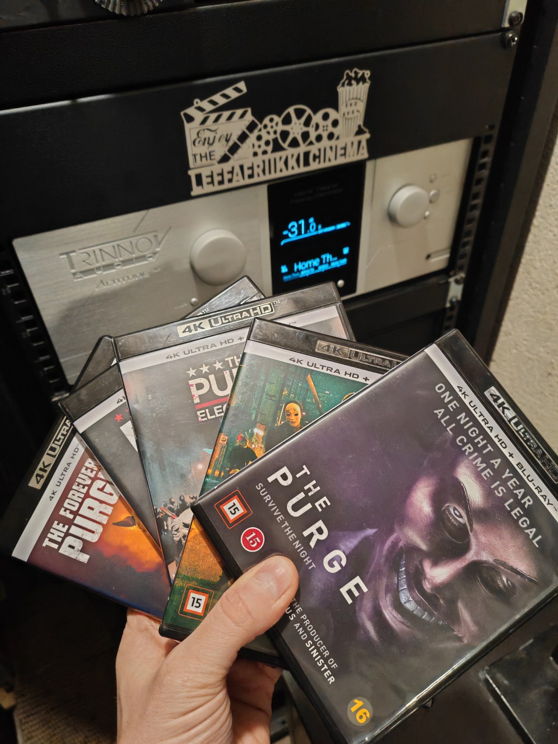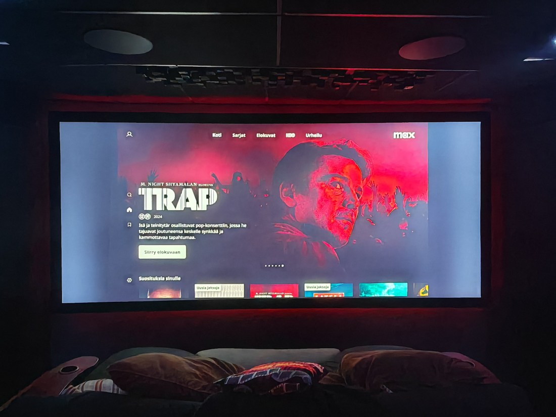 Kuvan osalta leffa näytti hyvältä, tosin ihan ei nyt uusi skriinin vielä tässä päässyt parhaaseen loistoonsa koska kyseessä yllättäen 16:9 formaatin leffa, eikä nyt muutenkaan ihan sellainen leffa ollutkaan jossa se olisi loistoonsa päässyt. Lisäksi striimi on aina striimi muutenkin. Itse kankaasta kuitenkin sen verran, että onhan tuolla kuvan laadulla ihan älytön ero kun laittaa uuden ja vanhan rinnakkain, mustissa ja tarkkuudessa ero todellakin on silmin nähtävissä, eikä tuo kirkkauskaan yhtään haita asiaa. Scriiniltä heijastavan valon määrä nousee merkittävästi, joten onhan tuossa gain aivan eri luokkaa kuin Eurokankaan kankaassa. Siihen mitä olisi Seymour tai Stewart ollut en osaa vastata, mutta tuohon hankintaan etenkin hinta-laatusuhteeltaan en voisi olla enempää tyytyväinen ja voin kyllä lämpimästi suositella XY screenssin sound Max 4K:ta muillekin DIY rakentajille. Projekti siis maalissa ja lopputulos enemmän kuin onnistunut. Nyt voin taas hyvillä mielin todeta, että huone on tällä erää valmis (kalibroinnit puuttuu), ja nyt se voisi jonkin aikaa ollakin, ainakin siihen asti kun kaikki laskut on maksettu!